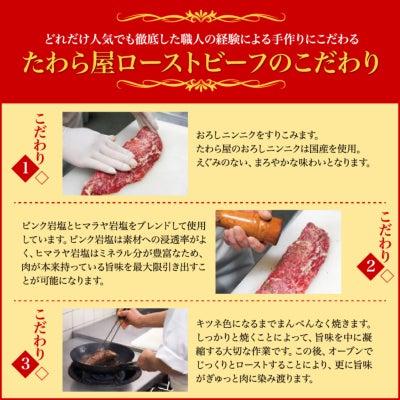 ローストビーフは冷蔵庫で3〜6時間解凍してください。だしスープは湯煎で沸騰したまま5〜6分加熱してください。あとはお茶漬けの要領で、よそったご飯にローストビーフをのせてからだしスープを注いでお召し上がりください。お好みで附属の黒胡椒をご利用ください。※詳細は同梱の[お召し上がり方]をご覧下さい。