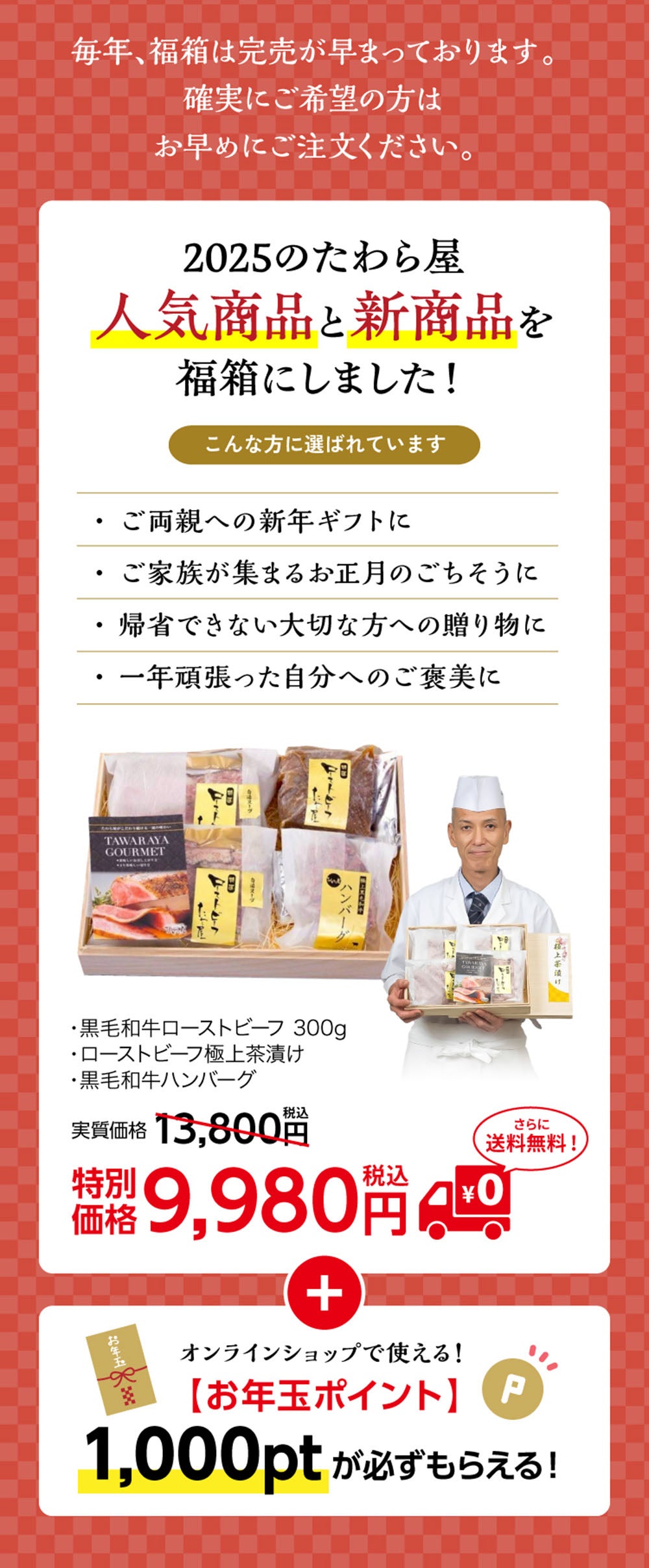 他の画像を見る 【限定300セット】 「ご予約」【福箱】白湯茶漬け 2人前&黒毛和牛サーロインローストビーフ500g 1個セット クール便(冷蔵) 価格 ¥ 19,800 税込 販売を終了しました。 詳細を見る お気に入りに登録する