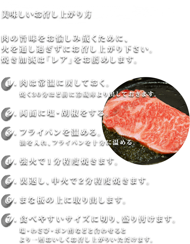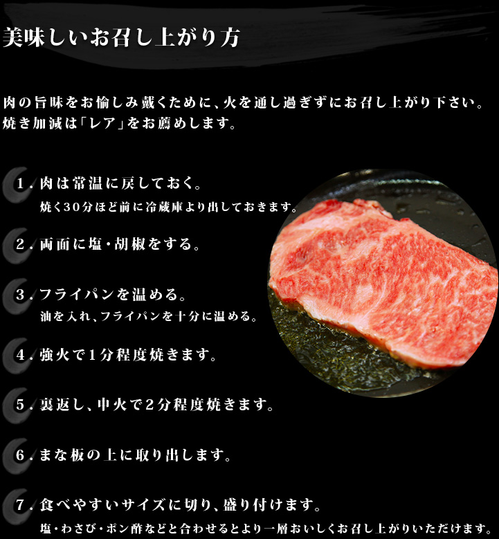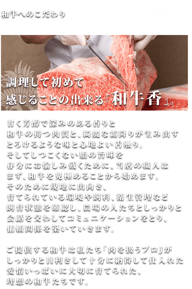 レアに焼き上げて口に運ぶとそこには驚きと感動が。初めて味わう柔らかな食感は輸入牛ではけっして味わうことができないでしょう。
