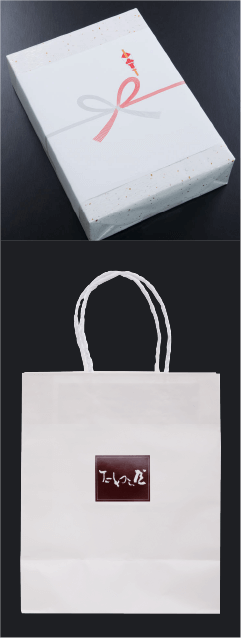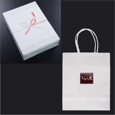 ご贈答用の場合、ご希望者には熨斗対応を致しております。 また、先様に直接持ち運んでのお渡しの場合は手提げ袋もご用意できます。