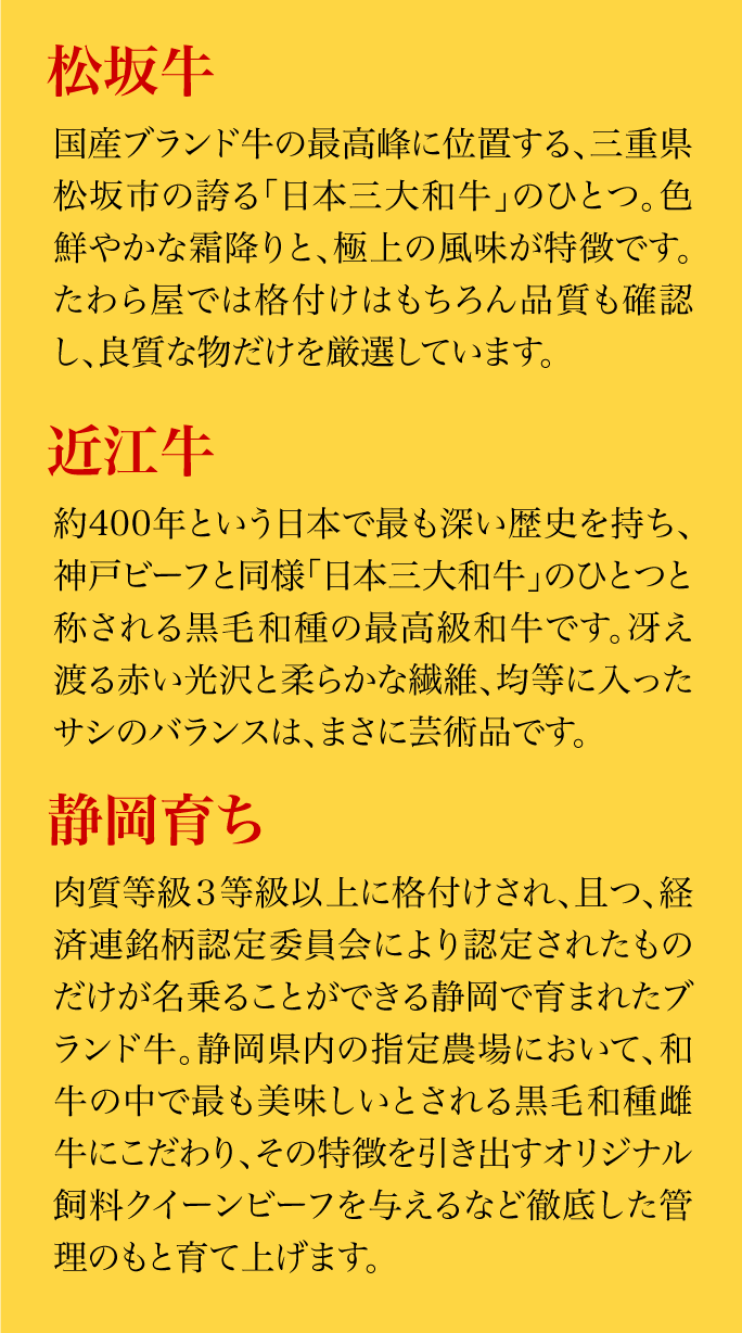艶やかな空間で気ままに優雅に、ブランド牛を食して幸せを感じて頂けるよう、全国各地の銘柄黒毛和牛を用意し、本物も肉の旨みを、寛ぎと和みの空間でゆったりと楽しめます。